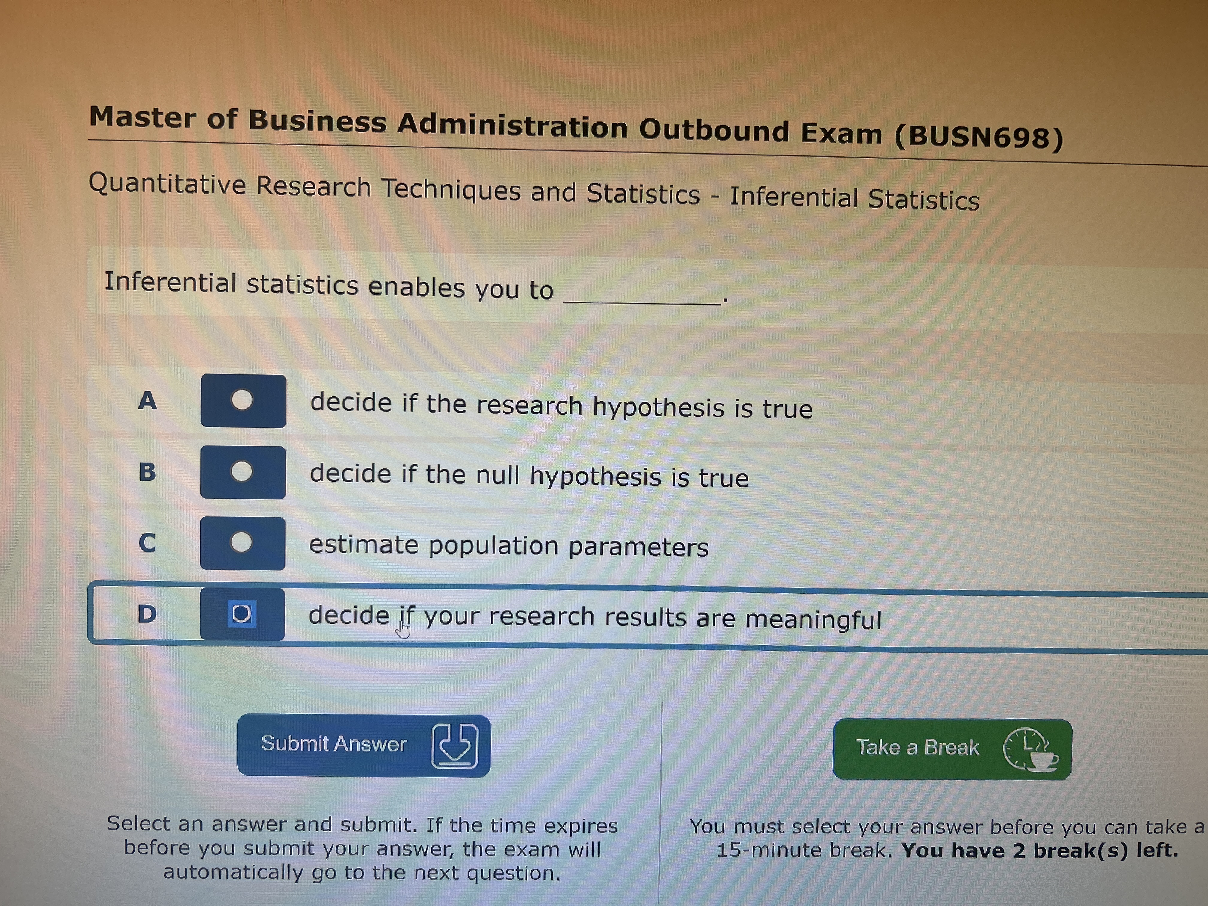 Master of Business Administration Outbound Exam (BUSN698) Quantitative Research Techniques and Statistics - Inferential Statistics Inferential statistics enables you to \( \qquad \) . A decide if the research hypothesis is true B decide if the null hypothesis is true C 0 estimate population parameters D decide if your research results are meaningful Submit Answer Take a Break Select an answer and submit. If the time expires before you submit your answer, the exam will automatically go to the next question. You must select your answer before you can take a 15-minute break. You have 2 break(s) left.
