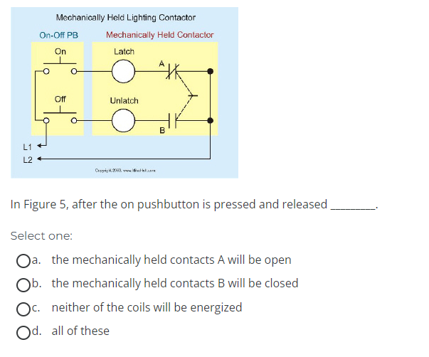 Mechanically Held Lighting Contactor In Figure 5, after the on pushbutton is pressed and released Select one: a. the mechanically held contacts