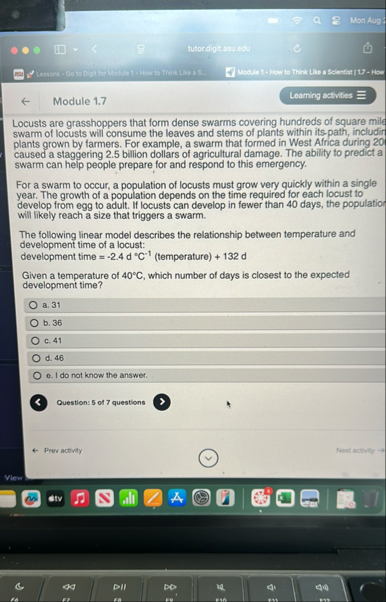 40\deg C, which number of days is closest to the expected development time? a. 31 b. 36 c. 41 d. 46 e. I do not know the answer. Question: 5 of 7 questions Prev activity Next activity
