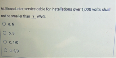 Multiconductor service cable for installations over 1,000 volts shall not be smaller than? AWG. a. 6 b. 8 c.