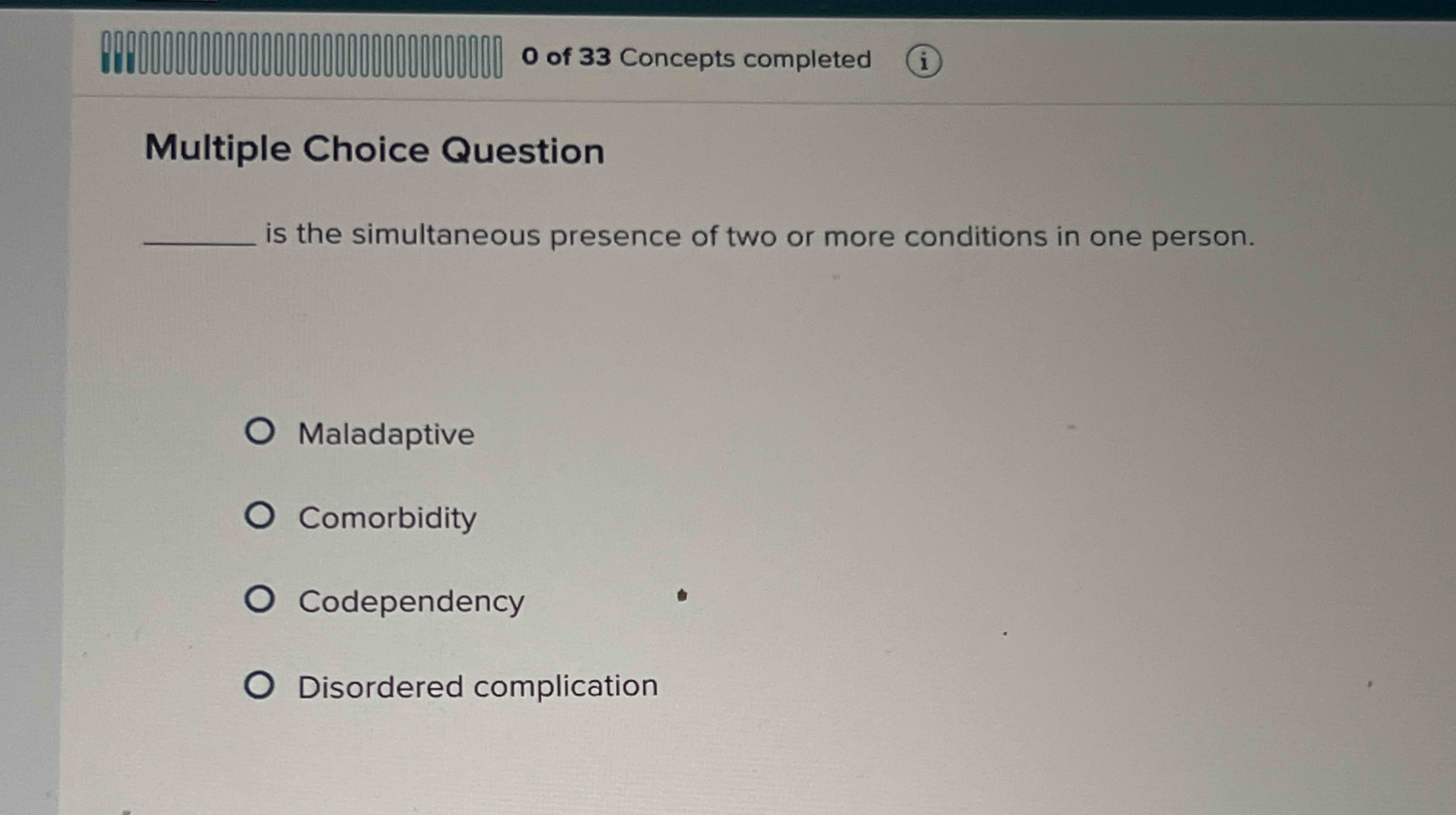 Multiple Choice Question is the simultaneous presence of two or more conditions in one person.MaladaptiveComorbidityCodependencyDisordered complication