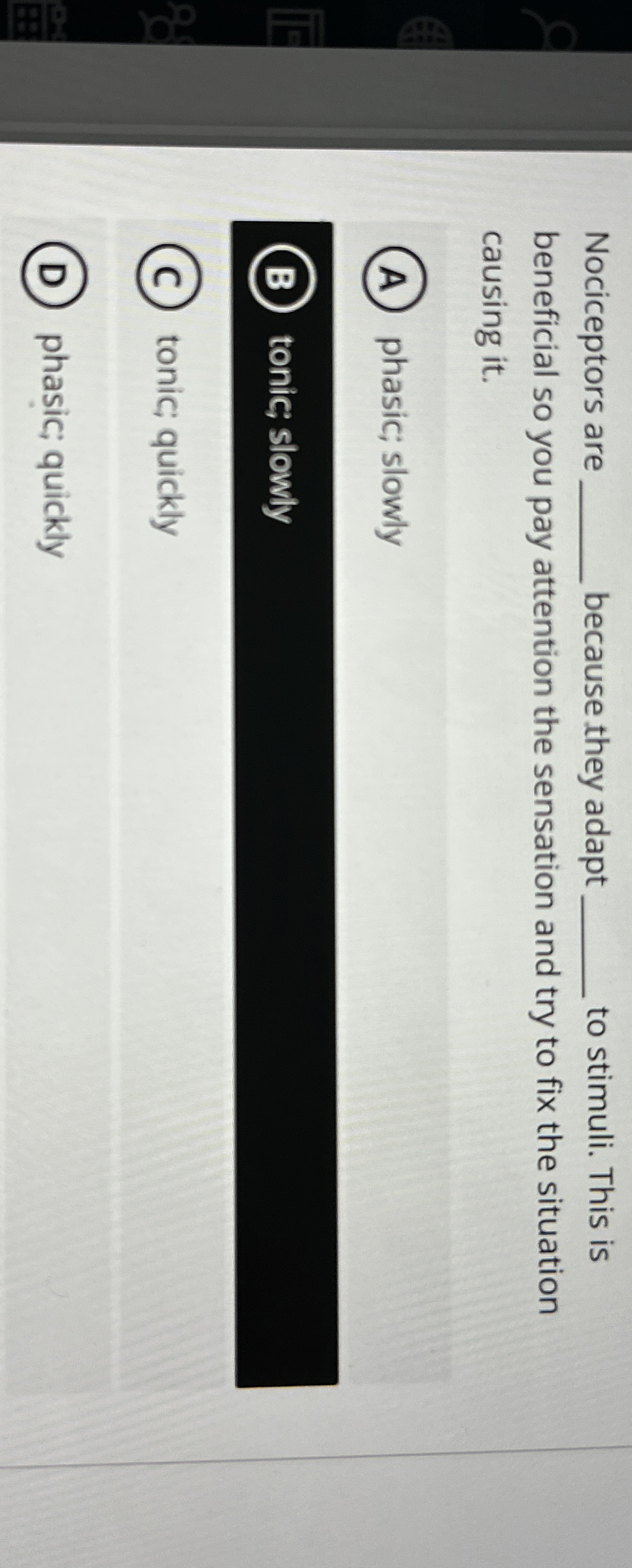 (Solved): Nociceptors are q, because they adapt to stimuli. This is beneficial so you pay attention the se ...