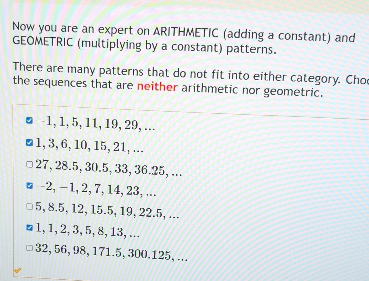 Now you are an expert on ARITHMETIC (adding a constant) and GEOMETRIC (multiplying by a constant) patterns. There are many patterns that do not fit into either category. Cho the sequences that are neither arithmetic nor geometric.