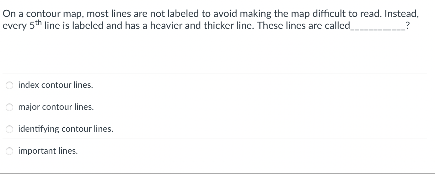 On a contour map, most lines are not labeled to avoid making the map difficult to read. Instead, every \( 5^{\text {th }} \) line is labeled and has a heavier and thicker line. These lines are called index contour lines. major contour lines. identifying contour lines. important lines.