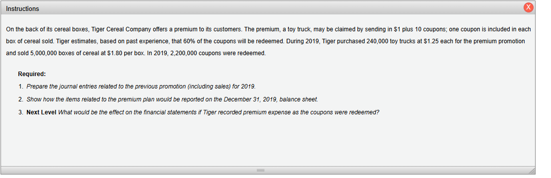 On the back of its cereal boxes, Tiger Cereal Company offers a premium to its customers. The premium, a toy truck, may be claimed by sending in \( \$ 1 \) plus 10 coupons; one coupon is included in each box of cereal sold. Tiger estimates, based on past experience, that \( 60 \% \) of the coupons will be redeemed. During 2019, Tiger purchased 240,000 toy trucks at \( \$ 1.25 \) each for the premium promotion and sold 5,000,000 boxes of cereal at \( \$ 1.80 \) per box. In 2019, 2,200,000 coupons were redeemed. Required: 1. Prepare the journal entries related to the previous promotion (including sales) for 2019. 2. Show how the items related to the premium plan would be reported on the December 31, 2019, balance sheet. 3. Next Level What would be the effect on the financial statements if Tiger recorded premium expense as the coupons were redeemed?