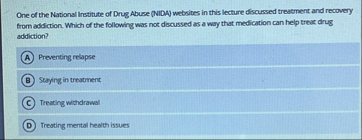 One of the National Irstitute of Drug Abuse (NIDN) websites in this lecture discussed treatment and recovery from addiction. Which of the following was not discussed as a way that medication can help treak drug addiction? Preventing relapse Sesying in treatment Treating withdrawal Treating mental health issues