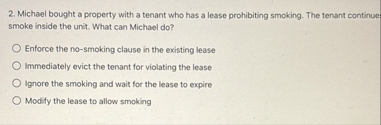 Michael bought a property with a tenant who has a lease prohibiting smoking. The tenant continue: smoke inside the unit. What can Michael do?