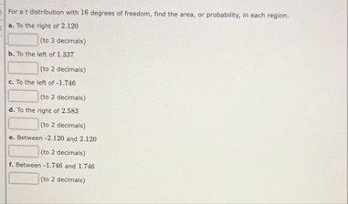 t distribution with 16 degrees of freedom, find the area, or probability, in each region.