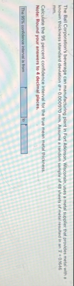 Calculate the 95 percent confidence interval for the true mean metal thickness.
