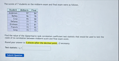 Find the value of the (Spearman's) rank correlation coefficient test statistic that would be used to test the claim of no correlation between midterm score and final exam score.