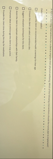 A nurse is planning interventions for a client to improve their physical weibeing which of the following interventions should the nurse plan to inplement?