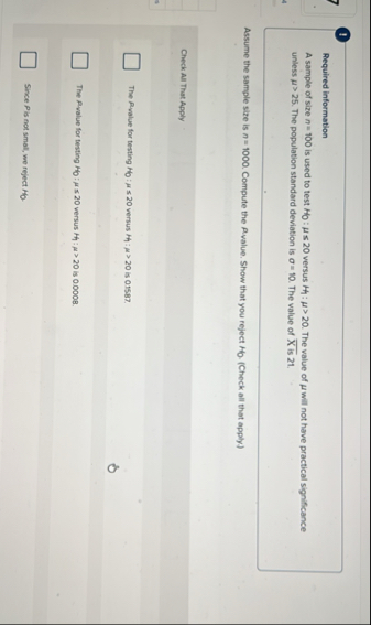 n=1000. Compute the Avalue. Show that you reject Ho. (Check all that apply)