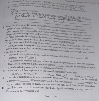 5. Ir can be difficult for a Democrat or Republican political candidate to exape the politics opinion of the candidate's party. Public perception of the candidate tender to correspond to public perceptions of the candidate's party, but sometimes cand idates are dignificandly more or less popular than their parties. In this exercles, you'll compute feeling thermometer rating for Joe Biden before the 2020 election (fi_biden_pre) to contemporaneous feeling thermometer ratings of the Democratic Party (ft_dem) as measured in the NES Dataset.