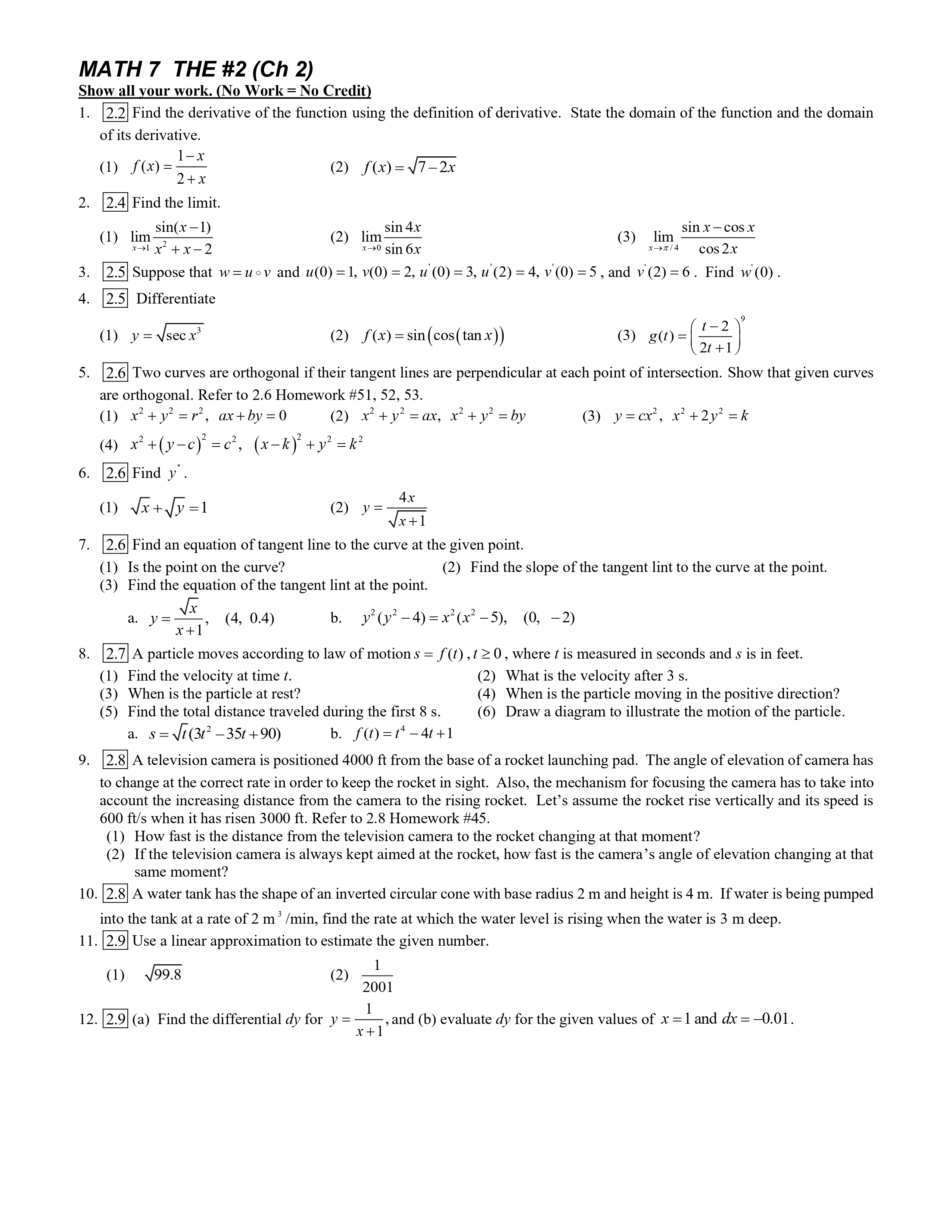 Math 7 Show all your work. 2.2 Find the derivative of the function using the definition of derivative. State the domain of the function and the domain of its derivative. (1) f(x)=(1-x)/(2+x) (2) f(x)=\sqrt(7-2x) 2.4 Find the limit. (1) \lim_(x->1)(sin(x-1))/(x^(2)+x-2) (2) \lim_(x->0)(sin4x)/(sin6x) (3) \lim_(x->(\pi )/(4))(sinx-cosx)/(cos2x) 2.5 Suppose that w=u@v and u(0)=1,v(0)=2,u^(')(0)=3,u^(')(2)=4,v^(')(0)=5, and v^(')(2)=6. Find w^(')(0). 2.5 Differentiate (1) y=\sqrt(secx^(3)) (2) f(x)=sin(cos(tanx)) (3) ,g(t)=((t-2)/(2t+1))^(9) 2.6 Two curves are orthogonal if their tangent lines are perpendicular at each point of intersection. Show that given curves are orthogonal. Refer to 2.6 Homework #51, 52, 53. (1) x^(2)+y^(2)=r^(2),ax+by=0 (2) x^(2)+y^(2)=ax,x^(2)+y^(2)=by (3) y=cx^(2),x^(2)+2y^(2)=k (4) x^(2)+(y-c)^(2)=
