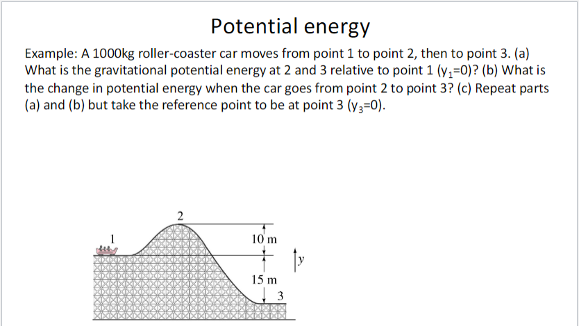 Potential energy Example: A 1000 kg roller-coaster car moves from point 1 to point 2 , then to point 3 . (a) What is the gravitational potential energy at 2 and 3 relative to point \( 1\left(y_{1}=0\right) \) ? (b) What is the change in potential energy when the car goes from point 2 to point 3 ? (c) Repeat parts (a) and (b) but take the reference point to be at point \( 3\left(y_{3}=0\right) \).