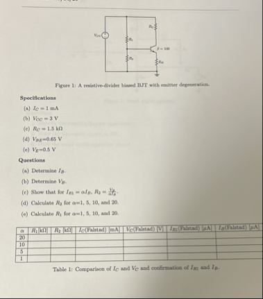 Figure 1: A resistive-divider binaed BJT with emitter degromeration. Specificattons (a)