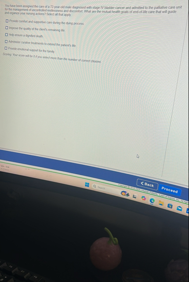 You have been assigned the care of a 72 -year-old male daynosed with sage IV bodyer cancer and admitted to the paliative care unit for the narigenent of uncontolled restessness and disconton. What are the multal health goals of end-of life care that will guide and enaunive you rersmy areass? Setect at Thut apply.