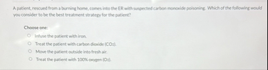 A patient, rescued from a burning home, comes into the ER with worectied cartom moncalde poisoning. Which of the following would you consider to be the best treatment strategy for the patient?