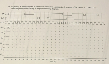 O pointa) A timing diagram is gives for 4 -bit counter. Assume the Que output of the counter is "1100" (12, in) at the beginning of the timing. Complete the timing diagram.