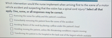 Which intervention would the nurse implement when arriving first to the scene of a motor vehicle accident and suspecting that the victim has a spinal cord injury? Select all that apply. One, some, or all responses may be correct.