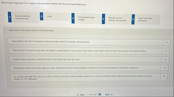 Match each argument for or against globalization below with the corresponding issue. 1 Socioeconomic 2 Jobs Development 3 Environment and Health 4 Results across nations and people 5 tabor and labor standards Match each of the options above to the tiems below: Free trade is the best strategy for advancing the world's economic development. The promise of export-led growth has failed to materialize in some parts of the world, especialy in parts of Latin America and sab-Saharan Adica. Trade creates new jobs, and these tend to be better than the old ones. Developed nations with more rigorous labor standards become disadvantaged as jobs move to developing rations with beer standards. To comply with NAF TAs ndes on trade in services, the Bush admiratration waved US. Clean ar standards which allowed trucks based in Mesco to had freight on U.S. highways. Prey 3 at 20 Next