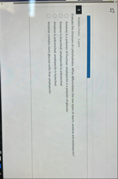 3 Multiple Choice 1 point Evaluate the structure of carbohydrates. What differentiates the two types of starch, amylose and amylopectin?