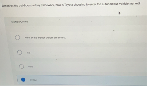 Based on the build-borrow-buy framework, how is Toyota choosing to enter the autonomous vehicle market? Multiple Choice