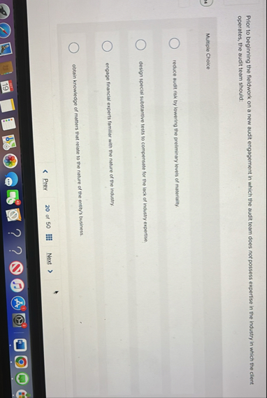 Prior to beginning the fieldwork on a new audit engagement in which the audit team does not possess expertise in the industry in which the client operates, the audit team should: