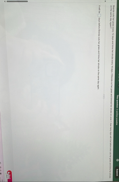Brenda cuts her grass every 12 days and trims her shrubs every 16 days. If Brenda cut her grass and trimmed her shribs on June 1 , how many days will ite belore she cats her grass ard trims her thise on the same day again?