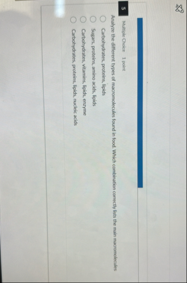 Analyze the different types of macromolecules found in food. Which combination correctly lists the main macromolecules