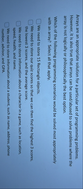 Arrays are an appropriate solution for a particular set of programming problems. However, it is also true that arrays can be used/abused to solve problems where the array is not logically or philosophically the best option.