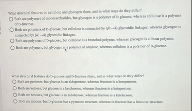 ? Both are polymers of monosaccharides, but glycogen is a polymer of D-glacose, whereas cellulose is a polymer of D-fructose.