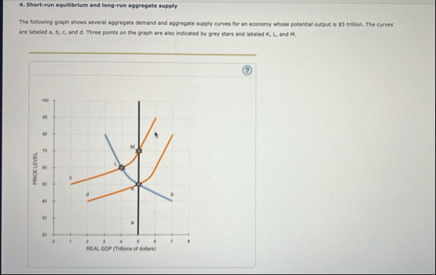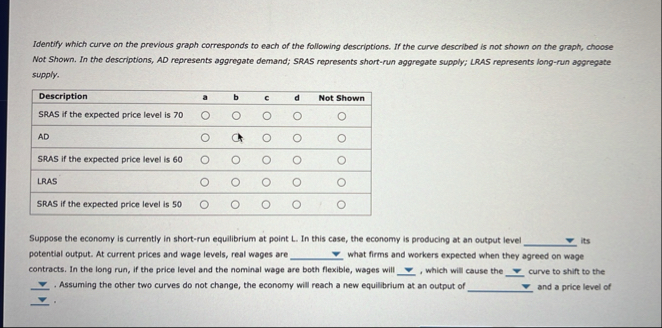 _(_())_(_())Identify which curve on the previous graph corresponds to each of the following descriptions. If the curve described is not shown on the graph, choose Not Shown. In the descriptions, AD represents aggregate demand; SRAS represents short-run aggregate supply; LRAS represents long-run aggregate supply.