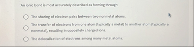 _(_())_(_()) The transfer of electrons from one atom ftypicelly a metal) to another atom (typically a nonmetal, resulting in oppositiely charged ions.