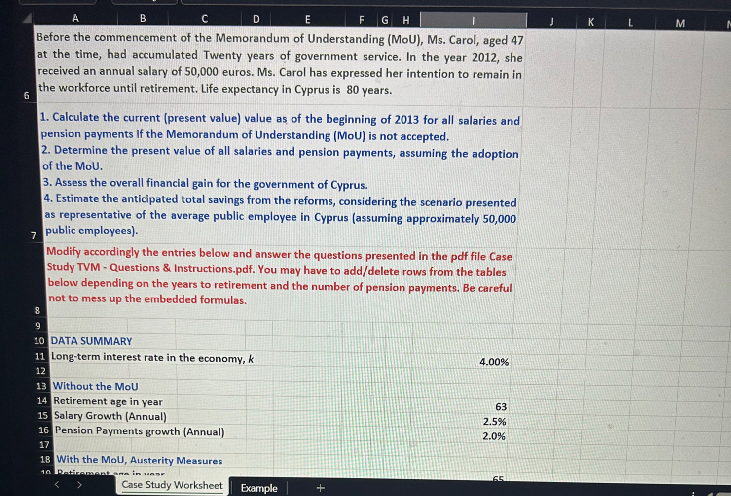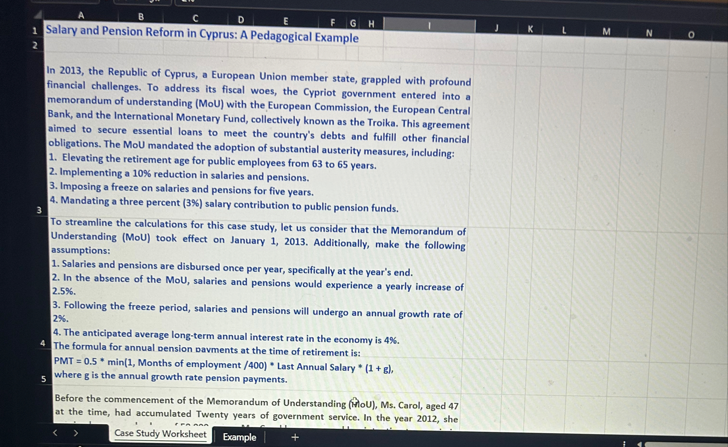 Before the commencement of the Memorandum of Understanding (MoU), Ms. Carol, aged 47 at the time, had accumulated Twenty years of government service. In the year 2012, she received an annual salary of 50,000 euros. Ms. Carol has expressed her intention to remain in the workforce until retirement. Life expectancy in Cyprus is 80 years.