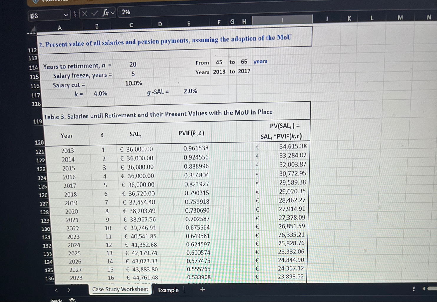 Calculate the current (present value) value as of the beginning of 2013 for all salaries and pension payments if the Memorandum of Understanding (MoU) is not accepted.