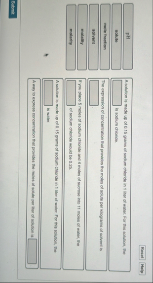 pH solute mole fraction solvent molality molarity A solution is made up of 0.15 grams of sodium chiloride in 1 liter of water. For this solution, the is sodium chloride. The expression of concentration that provides the moles of solute per kilograms of solvent is If you place 5 moles of sodium chloride and 4 moles of sucrose into 11 moles of water, the of sodium chloride would be 0.25 . A solution is made up of 0.15 grams of sodium chioride in 1 liter of water. For this solution, the is water. A way to express concentration that provides the moles of solute per liter of solution is
