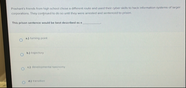 Pimhari's biends from ingh school chose a different route and uned their cyber sibls to hack indomation systems of Larger corporations. They confined to do so until they were arested and sermerced to prison This prison sentence would be best described as a