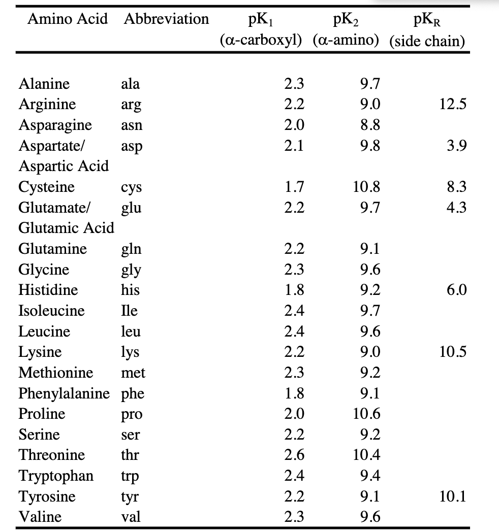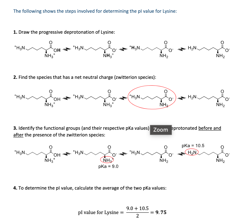 pI value for Lysine =(9.0+10.5)/(2)=9.75