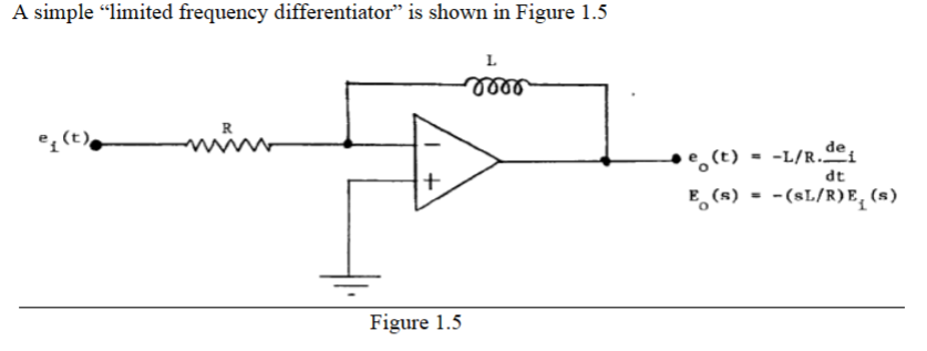 1. Differentiator Circuit A) Using PSpice or similar circuit simulator - Construct the differentiator circuit of Figure 1.5 using a 10mH inductor and a k? resistor. Apply an input of a Triangular wave with a 2V peak to peak input. Run a series of transient response with input frequencies from 2,000Hz to 10,000Hz in 2KHz steps and document your results. B) Compute the peak-to-peak value of the voltage output and compare the results to those measured. Show all calculations explain the main differences between simulated and calculated values. Why this differentiator circuit is not a perfect differentiator? For PSpice use a LM741 as the Op-Amp. C) Create a Matlab Simulink Simulation that performs the same simulation with transfer function Blocks and apply the same input set. Compare and results from the hand analysis and different simulation methods.