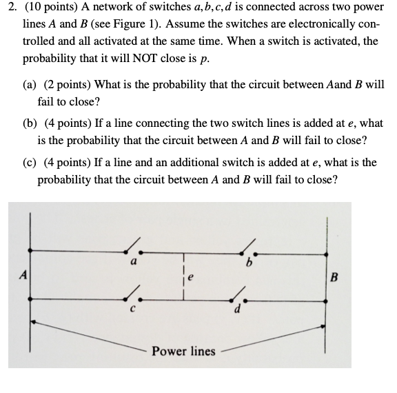 (10 points) A network of switches \( a, b, c, d \) is connected across two power lines \( A \) and \( B \) (see Figure 1). Assume the switches are electronically controlled and all activated at the same time. When a switch is activated, the probability that it will NOT close is \( p \). (a) (2 points) What is the probability that the circuit between \( A \) and \( B \) will fail to close? (b) (4 points) If a line connecting the two switch lines is added at \( e \), what is the probability that the circuit between \( A \) and \( B \) will fail to close? (c) (4 points) If a line and an additional switch is added at \( e \), what is the probability that the circuit between \( A \) and \( B \) will fail to close?
