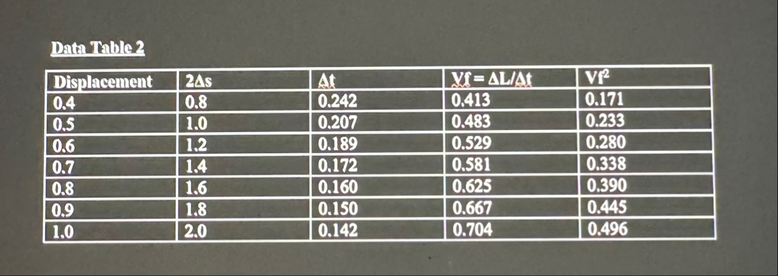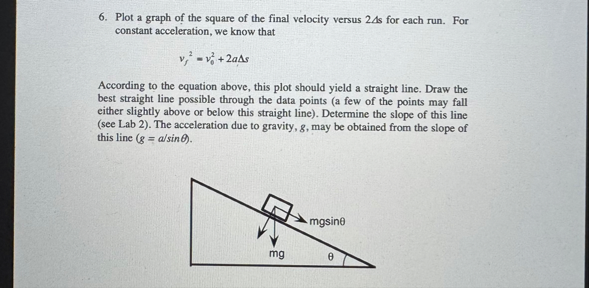 v_(f)^(2)=v_(0)^(2) 2a\Delta sAccording to the equation above, this plot should yield a straight line. Draw the best straight line possible through the data points (a few of the points may fall either slightly above or below this straight line). Determine the slope of this line (see Lab 2). The acceleration due to gravity,