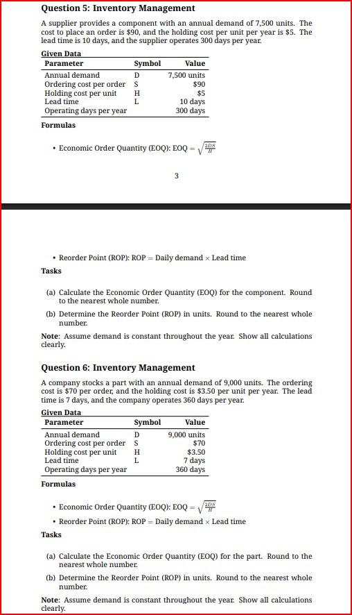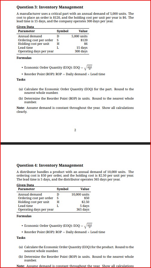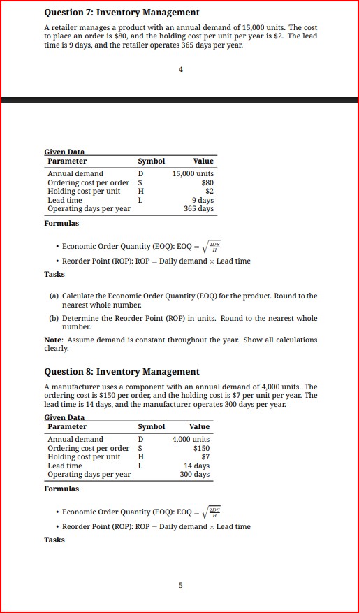 Practice EOQ and ROP computations across a range of product scenarios, including retail, manufacturing, 3and distribution contexts. These problems cover all essential inventory parameters, focusing on minimizing total costs and maintaining adequate stock during varying lead times and demand rates.
