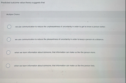 Predicted outcome value theory suppests that Murbple Choice we use communication to reduce the unplearantness of ancertainty in order to get to know a person bettec we use communication to reduce the pleasanmess of uncenainty in order bo keep a person at a divtance. when we leam infonmation about someone, that informution can make us liae the person more. when we learn information about someone, that information can male us the the pervon levs.