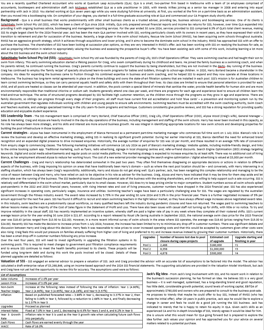 Prepare a response to Jack on the potential decision to acquire Splashbaby Swim School Pty Ltd for $3,268,846. Your response should be based on specific evidence from the case study information and/or the financial information contained in the income-based valuation model. You can assume there are no tax issues within this assessment. In your response: 1. Explain two (2) ethical issues or dilemmas that Jack needs to consider as part of the pending decision. For each ethical issue or dilemma, recommend the best approach to address it. 2. Explain four (4) key non-financial issues, excluding ethical issues, that should be considered as part of the decision to acquire SSS. For each non-financial issue, justify why it is significant to the pending decision. 3. Identify four (4) key errors in the income-based enterprise valuation calculation of $3,268,846. Justify why each error is key in relation to the valuation. 4. Assuming any ethical issues are resolved, based on your responses to Task 2–3 above, recommend whether Jack should proceed with the acquisition. Justify your recommendation.