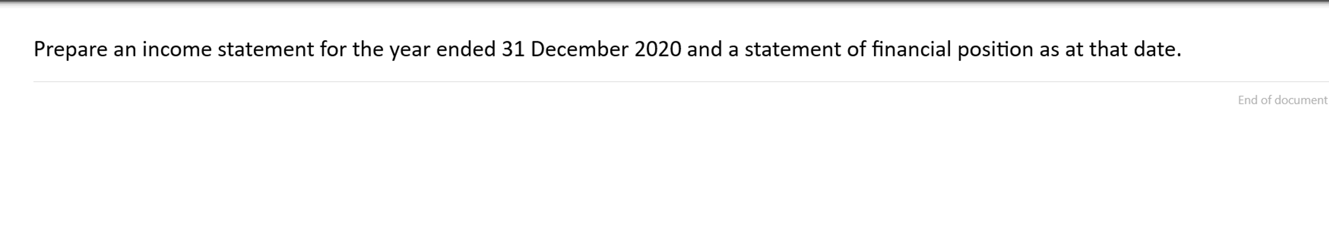 Preparing Financial Statement - Practice 2 You have been provided with the following trial balance as at 31 December 2020 for a limited liability company called Tonson Trial Balance as at 31 December 2020 The following additional information as at 31 December 2020 is available. 1. Inventory at 31 December 2020 was valued at Rs 275,000 2. The marketing expenses include Rs 5000 which relates to January 2021. 3. Based on past experience the allowance for receivable is to be increased to \( 5 \% \) of trade receivables. 4. Depreciation on building is \( 5 \% \) on cost 5. Depreciation on motor vehicle 20\% reducing balance method. 6. Depreciation of furniture and equipment at \( 20 \% \) on cost. 7. Energy expenses is due at 31 December 2020 amounting Rs 25,000 Required Prepare an income statement for the year ended 31 December 2020 and a statement of financial position as at that date. End of document
