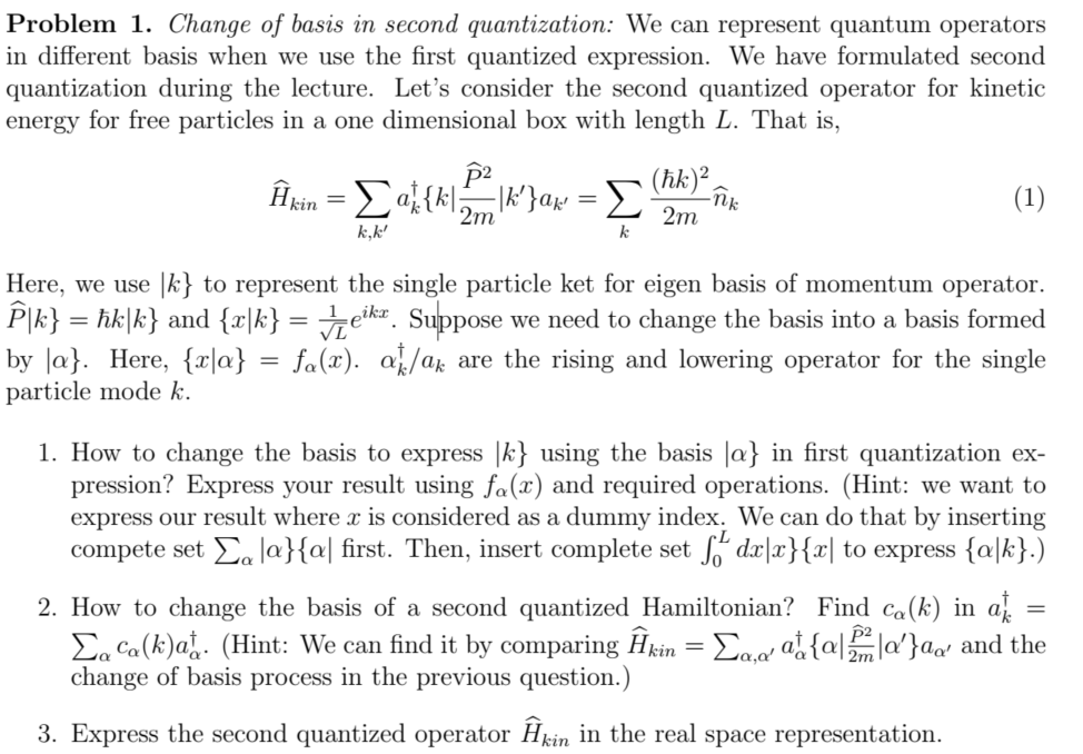 Problem 1. Change of basis in second quantization: We can represent quantum operators in different basis when we use the first quantized expression. We have formulated second quantization during the lecture. Let's consider the second quantized operator for kinetic energy for free particles in a one dimensional box with length
