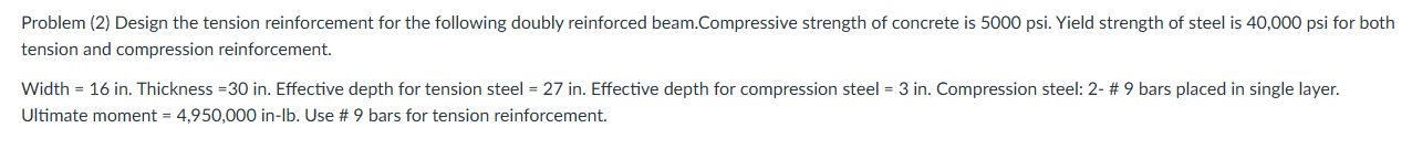 Problem (2) Design the tension reinforcement for the following doubly reinforced beam.Compressive strength of concrete is 5000 psi . Yield strength of steel is \( 40,000 \mathrm{psi} \) for both tension and compression reinforcement. Width = 16 in. Thickness = 30 in. Effective depth for tension steel = 27 in. Effective depth for compression steel = 3 in. Compression steel: 2 - \# 9 bars placed in single layer. Ultimate moment = 4,950,000 in-lb. Use \# 9 bars for tension reinforcement.