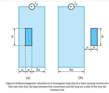 Problem 6.15: Emf in a rectangular loop due to a two-wire line current. A very long lossless thin two-wire line in air, with distance between axes of conductors equal to 4a, is fed at one end by an ideal current generator of low-frequency time-harmonic current intensity ig(t) = Ig0 cos \omega t, while the other end of the line is short-circuited. A rectangular wire loop of side lengths a and b is placed in the plane of the line, such that its two sides are parallel to the line and the distance of one of the sides from one of the line conductors is a. Neglecting end and propagation effects, i.e., computing the magnetic field of the line as if it were infinitely long and assuming that the line current is the same in every cross section, as well as the magnetic field due to induced current, find the emf induced in the loop for situations in (a) Fig. 6.32(a) and (b) Fig. 6.32(b), respectively. (a) (b) Figure 6.32 Electromagnetic induction in a rectangular loop due to a time-varying current of a thin two-wire line: (a) loop between line conductors and (b) loop on a side of the line; for Problem 6.15.