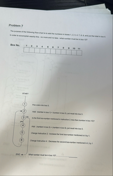 nIs the first boe-number merioned in Inatuction 2, less than (number in box 10)? yes 4 Add: (number in box 5) (number in box 91. put reuit into box. 5. Charge instruction 2: horease the forsit box-number mentioned in it by 1. Change instruction 4: Decrease the second box-namber mentioned in ik, by 1 END What number must be in box 10?